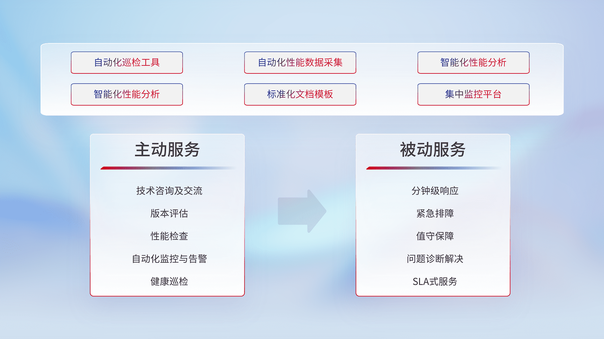 智能化工具和标准化文档,,,,保障服务质量,,提供主动服务(包含技术咨询、、、版本评估、、、、性能检查、、、自动化监控与告警、、健康巡检)和被动服务包含(分钟级响应、、紧急排障、、、值守保障、、、问题诊断解决、、、SLA服务)。。